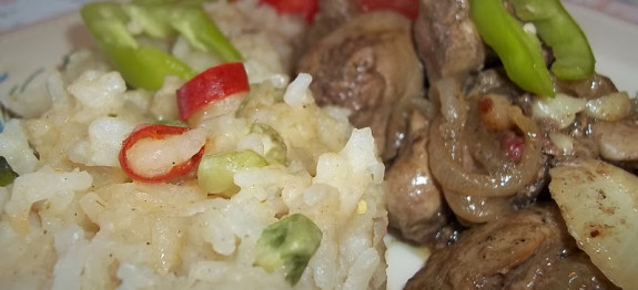 A tányérra raktam a rizsből és májból, s díszítettem paradicsom és paprika szeletekkel.