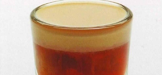 A whisky-s pohárba beletöltjük a Campari-t. Erre öntjük rá barna Créme de Cacao-t.