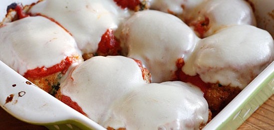 A csirkéket mártsuk felvert tojásba, majd forgassuk zsemlemorzsába és helyezzük a tepsinkbe, majd fújjuk be egy kis olajjal. Süssük 25 percig. Vegyük ki a sütőből, tegyünk mindegyik csirke tetejére egy evőkanál paradicsom szószt, majd helyezünk rá egy vastagabb szelet mozzarella sajtot. Tegyük vissza a sütőbe és süssük, amíg a sajt megolvad a tetején, körülbelül 3 percig.