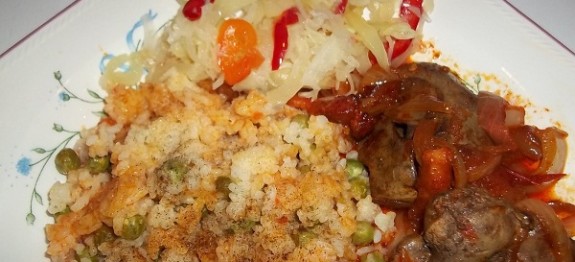 A rizshez hozzáadom a borsót, s felteszem főni. A májat leöblítem, kettévágom. Egy serpenyőben olajon megdinsztelem a hagymát, ráteszem a májat, majd a paprikákat és a paradicsomot, fűszerezem, s öntök rá vizet, dinsztelem. A vége felé öntök rá vörösbort.