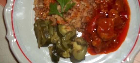 Tálalok, a tányérra szedek tarhonyát, cukkinit, pörköltet. A tarhonyára locsolok a szaftból, s díszítem petrezselyemlevéllel. Vörösborral fogyasztom.