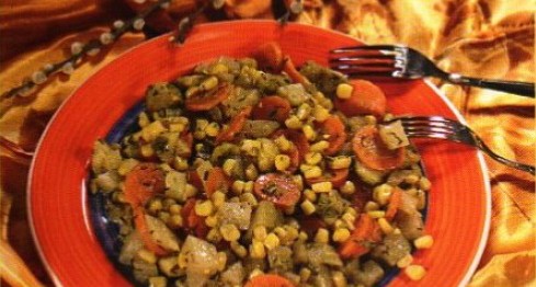 Előveszünk egy edényt, az olajat felhevítjük, majd hozzáadjuk az összevágott zöldségeket és a kukoricát. Kakukkfűvel, oregánóval, bazsalikommal, sóval és borssal ízlés szerint fűszerezzük, majd az egészet puhára pároljuk.