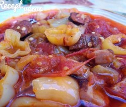 Paprikás krumplit készítettem, de tarhonyát és vörösbort is tettem bele. A lényeget most is a császárszalonna és csípős füstölt kolbász ...