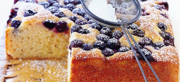 Béleljünk ki egy sütőformát sütőpapírral és öntsük bele a tésztát. Megszórjuk az áfonyával és barna cukorral és fahéjjal a tetejét. Sütőben 35 percig 180°C-on sütjük. Miután kihűlt, megszórjuk porcukorral.