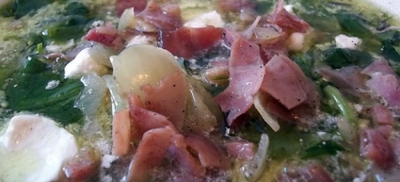 Tálaláskor teszek a leves tetejére a félretett baconból és sonkából.